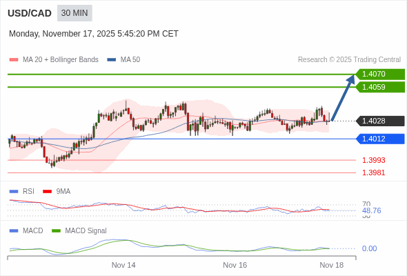 技术点评: RSI技术指标小于中性区域50。 MACD技术指标处在其信号线之上看多。 RSI向上突破50区域应该会触发进一步的上涨。 此外,价位高于其20天及50天移动平均线 ( 分别位于1.4028 和1.4028 )。