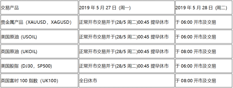 由于欧美市场阵亡将士纪念日假期 (2019年5月27日, 周一)部分市场交易产品休市,以下交易产品的交易时间将受假期期间影响,敬请阁下留意知悉!